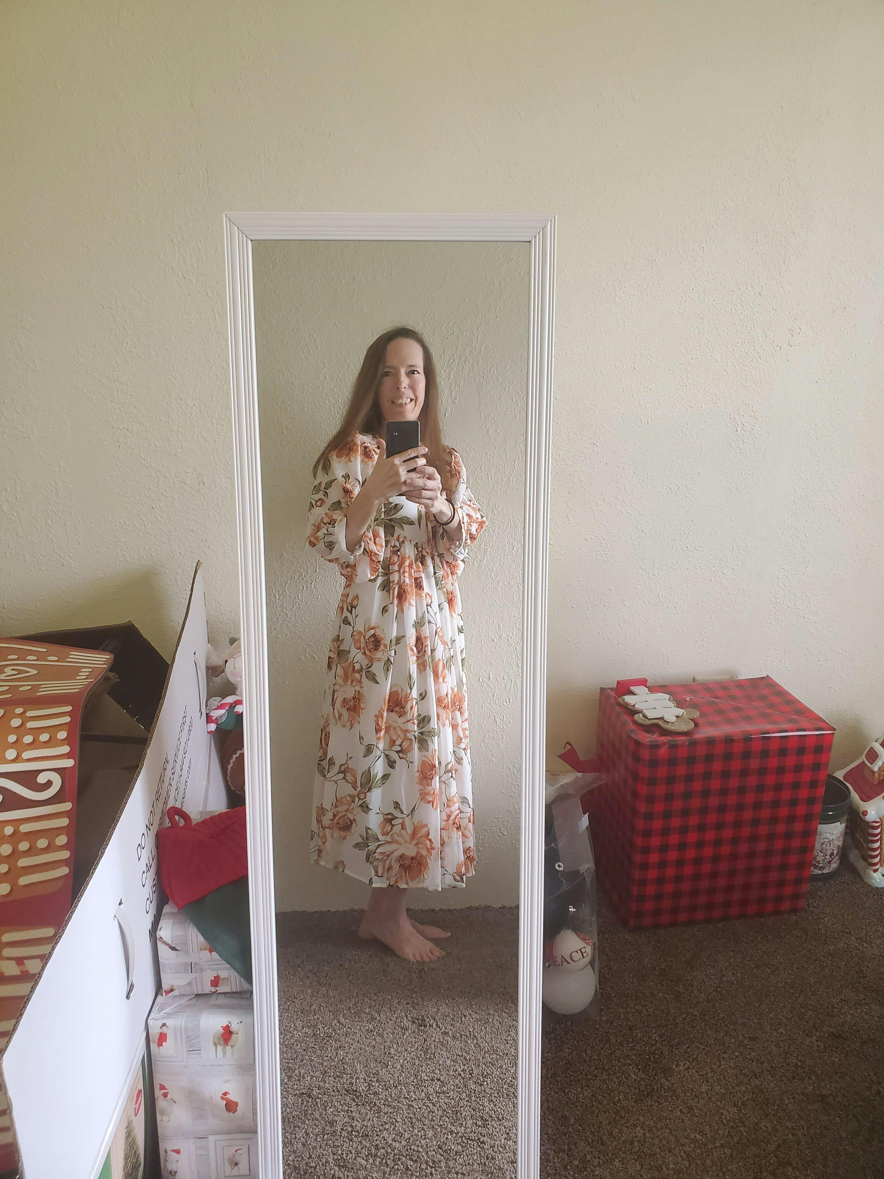 This flowy midi-dress is not only comfortable and practical, but flattering. Note the high waist in the front which dips to a lower waist in the back to accentuate the natural curve of your back. The 3/4 sleeve bishop sleeves are flowy and fun, and the v-neck features an optional tie. If you're looking for maximum comfort and maximum cute, this dress is for you!