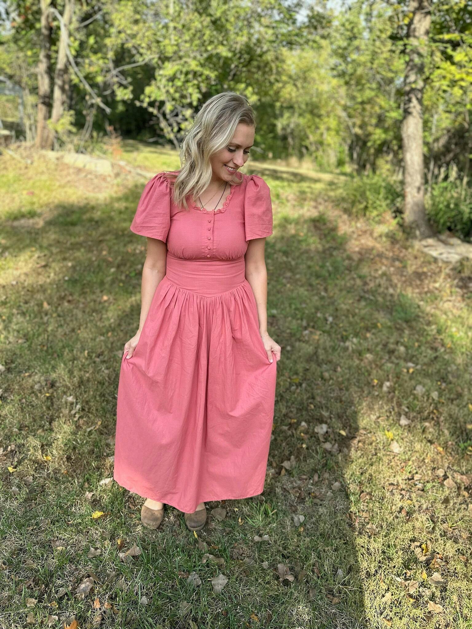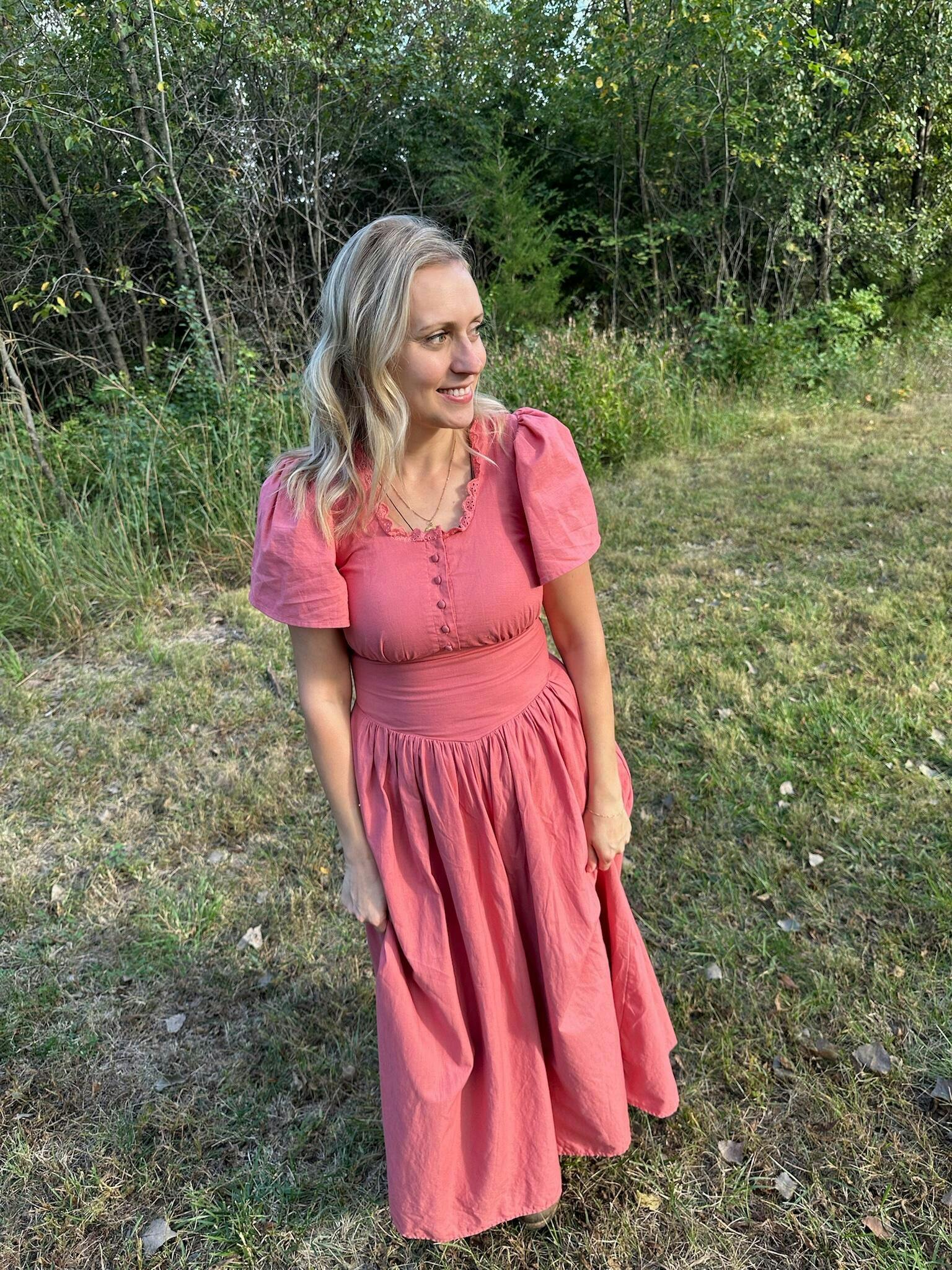 A gorgeous vintage-inspired dress. Enjoy the natural feel and fall of this cotton-linen blend fabric, with a lace-up back for generous, customizable sizing. This is the pink cotton dress you need in order to be a fair, storybook maiden ✨