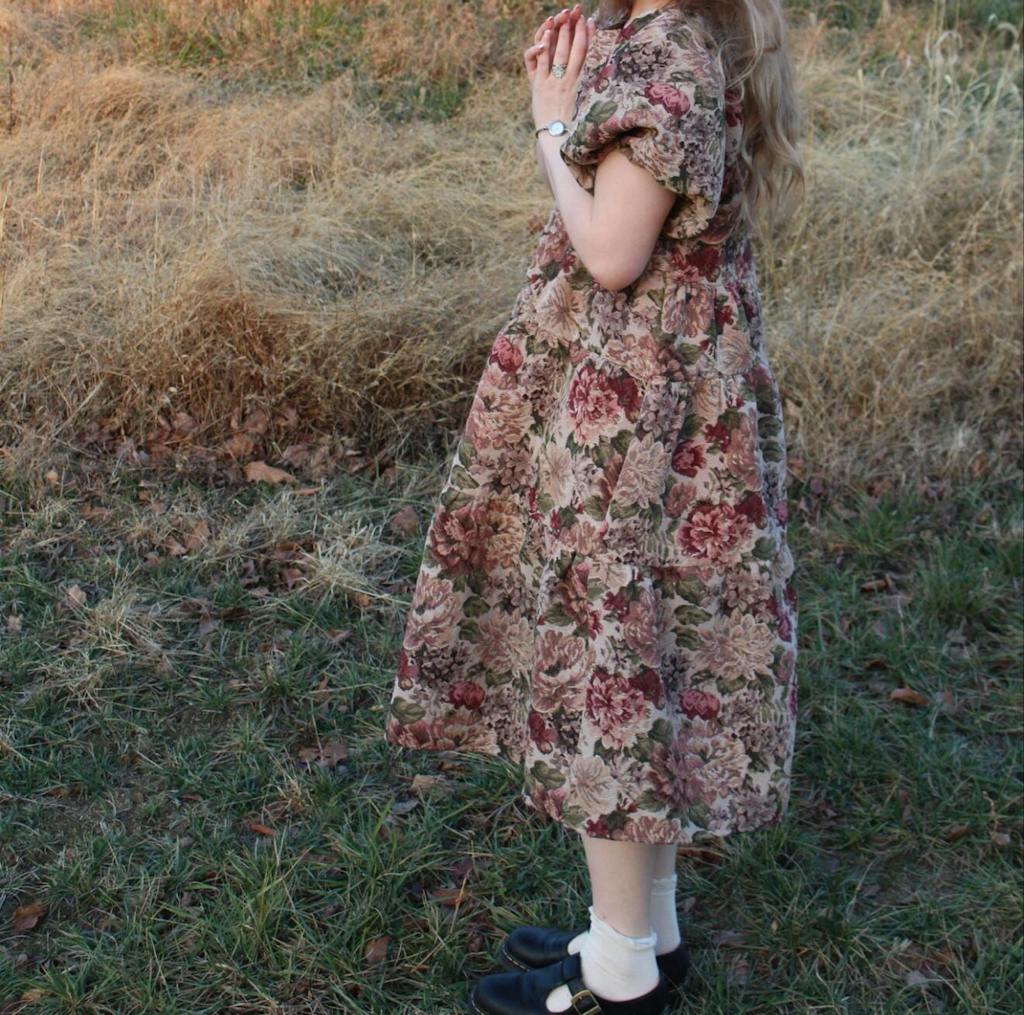 With a timeless rustic floral pattern and a modest babydoll silhouette, it can be easily dressed up with boots or heels, or dressed down with flats or sneakers. The flattering empire waist is paired with a slight drop waist in the back to give a feminine contour while maintaining the youthful, baby-doll style.